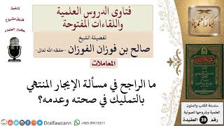 فضيلة الشيخ وفقكم الله يقول ما الراجح في مسألة الايجار المنتهي بالتمليك في صحته وعدمه ما يحتاج الراجح باطل الايجار المنتهي بالتمليك باطل وقد صدر فيه قرار من هيئة كبار العلماء من عدة سنوات واعلن والمخالف - 00:00:00ضَ