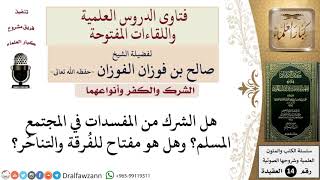 يقول فضيلة الشيخ وفقكم الله يقول هل الشرك من المفسدات في المجتمع المسلم وهل هو مفتاح؟ وهل هو مفتاح للفرقة والتناحر بلا شك ان الشرك مفسد للمجتمع المسلم ما يصلح المجتمع المسلم الا التوحيد - 00:00:00ضَ