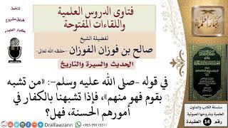 يقول فضيلة الشيخ وفقكم الله يقول في قوله صلى الله عليه وسلم من تشبه بقوم فهو منهم فاذا تشبهنا بالكفار بامورهم الحسنة وش الحسنة ما هي الحسنة الى المباحة اذا تشبهنا بهم في امورهم المباحة - 00:00:00ضَ