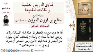 يقول انا هاجرت من بلد الكفر الى هذه البلاد المملكة. يقول انا هاجرت من بلاد الكفر الى هذا البلد المملكة والان زوجتي محتاجة للعلاج والعلاج يكلف كثيرا. يقول هل اجلس في هذا البلد الامين ومن الممكن ان تموت زوجتي بسبب عدم علاجها؟ لا - 00:00:00ضَ