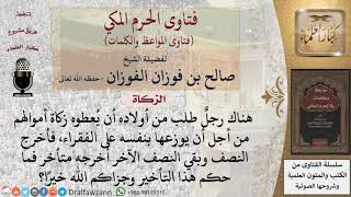 يقول السائل فضيلة الشيخ هناك رجل طلب من اولاده ان يعطوه زكاة اموالهم من اجل ان يوزعها ان يوزعها بنفسه على الفقراء. فاخرج نصف وبقي النصف الاخر اخرجه متأخر. فما حكم هذا التأخير؟ وجزاكم الله خيرا - 00:00:00ضَ