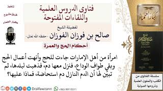 امرأة من اهل الامارات جاءت للحج وانهت اعمال الحج وبقي طواف الوداع فنزل معها دم فذهبت لبلدها ثم تبين لها ان الدم النازل دم استحاضة فماذا عليها؟ اذا كان الدم اللي عليها دم استحاضة وليس دم حيض وسافرت بدون وداع كان عليها فدية - 00:00:00ضَ