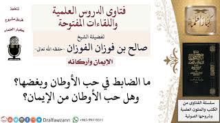 هذا سائل يقول ما الضابط في حب الاوطان وبغضها وهل حب الاوطان من الايمان؟ حب الاوطان طبيعي يعني طبيعة نفسية كل يحب وطنه ولربما ولربما منزل وكم منزل في الارض يألفه الفتى وحنينه ابدا لاول منزل هذي طبيعة - 00:00:00ضَ