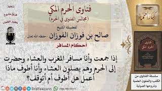 فهذا سائل يقول اذا جمعت وانا مسافر المغرب والعشاء وحضرت الى الحرم وهم يصلون العشاء وانا اطوف ماذا اعمل؟ هل اطوف ام توقف هل يطوفوا ام يتوقف ما يمكنون احد يطوف بعد اقامة الصلاة تتوقف الى ما - 00:00:00ضَ