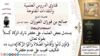 يستدل بعض العلماء على كفر تارك الزكاة كسلا بقوله تعالى فان تابوا واقاموا الصلاة واتوا الزكاة فكيف نجيب على عدم كفره؟ هذا في الكافر الاصلي. الكافر الاصلي اذا تاب الى الله وقال انا ما يخالف - 00:00:00ضَ
