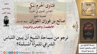 تقول السائلة نرجو من سماحة الشيخ ان يبين اللباس الشرعي للمرأة المسلمة؟ اللباس الشرعي للمرأة المسلمة هو اللباس الظافي الساتر الواسع الذي ليس فيه زينة ليس فيه زينة هذه اوصاف لباس المرأة ان يكون ظافيا على جميع بدنها - 00:00:00ضَ