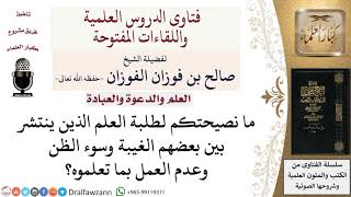 يقول ما نصيحتكم لطلبة العلم الذي الذين ينتشر بين بعضهم الغيبة وسوء الظن وعدم العمل بما تعلموه هذا من الشيطان على طلبة العلم وهم اولى بذلك ان يتركوا الغيبة والنميمة - 00:00:00ضَ