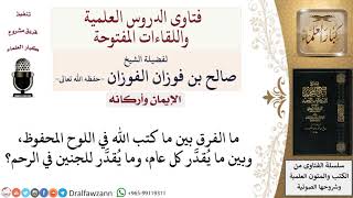 هذا سائل يقول ما الفرق بينما كتب الله في اللوح المحفوظ وبين ما يقدر كل عام وما يقدر للجنين في الرحم الكتابات متعددة كتابة عامة وهذه في اللوح المحفوظ كتابة على الجنين - 00:00:00ضَ