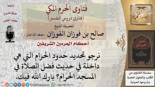 يقول السائل نرجو تحديد المسجد الحرام التي هي داخل او حدود الحرام. التي هي داخلة في حديث فضل الصلاة في المسجد الحرام. بارك الله فيك. حدوده الاميال. اميال الحرم والاعلام المنصوبة على حدود الحرم من كل الجهات. هذه حدود الحرم - 00:00:00ضَ