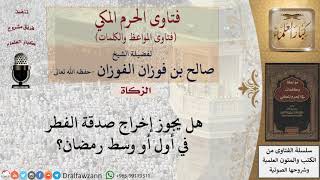 اللي يسأل اقول هل يجوز اخراج صدقة الفطر في وسط في اول او وسط رمظان قال بهذا بعض العلماء لكن الصحيح انه ما تخرج الا ليلة العيد او قبل العيد بيوم او يومين كما كان السلف يفعلون هذا - 00:00:01ضَ
