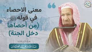اما قوله صلى الله عليه وسلم من احصاها دخل الجنة يعني ان لله وتسعين اسم من احصاها دخل الجنة. فهذه ذكرت يعني ذكر هذا العدد لهذا الحكم. لان من يحصيها يدخل الجنة. والاحصاء اختلف في معناه. معنى احصاها - 00:00:01ضَ
