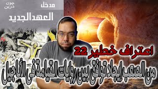 صل الى حد التناقض خصوصا في روايات القيامة. مرة تانية من كتاب مدخل العهد الجديد لجون درين في الصفحة رقم مية اتنين وخمسين تحت عنوان روايات القيامة بيقول الاتي. من الصعب ايجاد توافق بين روايات القيامة في - 00:04:20ضَ