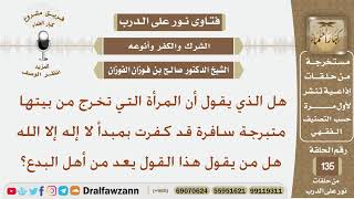 هل الذي يقول ان المرأة التي تخرج من بيتها متبرجة سافرة قد كفرت بمبدأ لا اله الا الله؟ هل من يقول هذا يعد من اهل البدع هذا قول فيه غلو ففيه خطر كبير. نعم التي تخرج من بيتها غير متسترة تعتبر قد ارتكبت ذنبا عظيما - 00:00:00ضَ