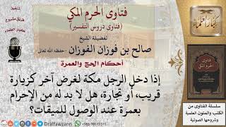 يقول اذا دخل الرجل مكة لغرض لغرض اخر كزيارة قريب او تجارة هل لابد له من الاحرام بعمرة؟ عند وصول الميقات الصحيح انه لا يلزمه اذا لم ينوي عمرة ولا حج - 00:00:00ضَ
