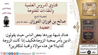 احسن الله اليكم صاحب الفضيلة هذا السائل يقول هناك شبهة يريدها بعض الناس حيث يقولون الدين يأمر بمحبة الزوجة فكيف اذا كانت الزوجة كتابية؟ هل هذه موالاة ومحبة للكافرين؟ ان كان يحبها من اجل دينها فهي موالاة. نعم - 00:00:00ضَ