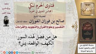 هل من فضل لهذه السور الكهف الواقعة ياسين؟ لا اعلم شيئا ثابتا في فضل هذه السور لكن ورد ان ان الكهف تقرأ يوم الجمعة ورد هذا وعمل به بعض الصحابة اذا قرأ فلا بأس بذلك. ياسين ورد انها تقرأ على - 00:00:00ضَ