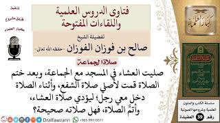 وهذا سائل يقول احسن الله اليكم صليت العشاء في المسجد مع الجماعة ها قل صليت العشاء في المسجد مع الجماعة وبعد ختم الصلاة قمت لاصلي صلاة الشفع واثناء الصلاة دخل معي رجل ليؤدي صلاة العشاء واتم الصلاة فهل صلاته صحيحة - 00:00:00ضَ