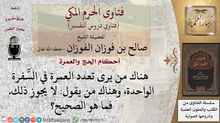 تقول هناك من يرى تعد للعمرة في سفرة واحدة وهناك من يقول لا يجوز ذلك فما هو الصحيح؟ اما لا يجوز هذا خطأ يجوز ولكن ينبغي ان يكون بين العمرتين فاصل زمني ولو يسير - 00:00:00ضَ