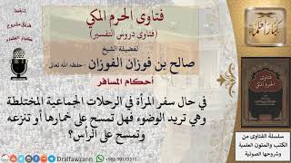 يقول في حال سفر المرأة في الرحلات الجماعية المختلطة وهي تريد الوضوء فهل تمسح على خمارها او تنزعه وتمسح على الرأس عند ايش يقول في حال السفر للمرأة في الرحلات الجماعية التي فيها اختلاط - 00:00:00ضَ