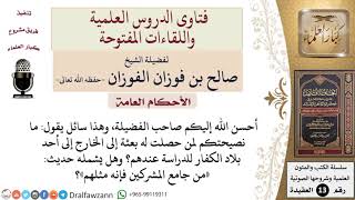 احسن الله اليكم صاحب الفضيلة وهذا السائل يقول ما نصيحتكم لمن حصلت له بعثة الى الخارج الى احد بلاد الكفار للدراسة عندهم وهل يشمله حديث من جامع المشركين فانه مثلهم - 00:00:00ضَ