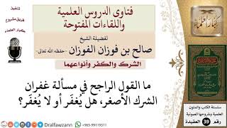 فضيلة الشيخ وفقكم الله يقول ما القول الراجح في مسألة غفران الشرك الاصغر هل يغفر او لا يغفر؟ الشرك الاصغر يغفر يغفر الذي لا يغفر هو الشرك الاكبر. اما الاصغر اختلف العلماء به لكن صحيح انه يغفر. اذا ترجحت حسناته - 00:00:00ضَ