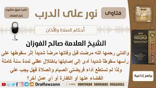والدتي رحمها الله مرضت قبل وفاتها مرضا شديدا اثر سقوطها على رأسها سقوطا شديدا ادى الى اصابتها باختلال عقلي لمدة سنة كاملة. ولذا لم تستطع اداء فريضتي الصيام والصلاة. فارجو افادتي هل يجب علي ان اقوم بالقضاء عنها او - 00:00:00ضَ