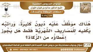 فضيلة الشيخ وفقكم الله. يقول هناك موظف عليه ديون كثيرة. وراتبه يكفيه للمصاريف الشهرية فقط هل يجوز اعطاؤه من الزكاة؟ ما يجوز اعطاءه من الزكاة اذا كان عنده ما يكفيه اذا كان راتبه يكفيه للنفقة - 00:00:00ضَ