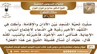 [146 -521] صليتُ تحية المسجد بين الأذان والإقامة، فأطلتُ الدعاء في التشهد الأخير، فما حكم فعلي؟