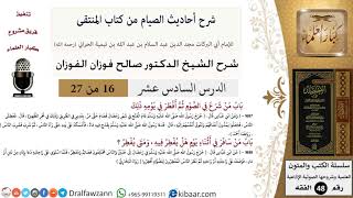 بسم الله الرحمن الرحيم المكتبة الصوتية لمعالي الشيخ الدكتور صالح بن فوزان الفوزان. حلقات تبث في اذاعة القرآن الكريم. شرح احاديث الصيام من كتاب المنتقى. الدرس السادس عشر بسم الله الرحمن الرحيم الحمد لله رب العالمين والصلاة والسلام على قائد الغر المحجلين نبينا محمد وعلى اله - 00:00:00ضَ