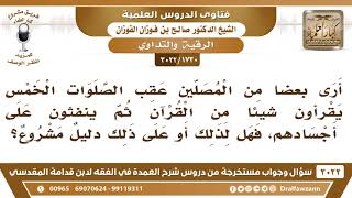 فضيلة الشيخ وفقكم الله يقول ارى بعضا من المصلين عقب الصلاة عقب الصلوات الخمس يقرأون شيئا من القرآن ثم ينفثون على اجسادهم فهل لذلك او على ذلك دليل مشروع؟ لا بأس بذلك. هذا من الرقية بالقرآن والورد لا بأس بذلك. ان شاء الله. نعم - 00:00:00ضَ