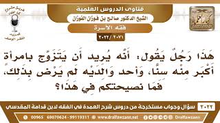 فضيلة الشيخ وفقكم الله هذا رجل يقول انه يريد ان يتزوج بامرأة اكبر منه سنا واحد والديه لم يرظى بذلك فما نصيحتكم في هذا؟ ايه دور له واحدة شابة يقول له واحدة شاب هالزين له بعد - 00:00:00ضَ