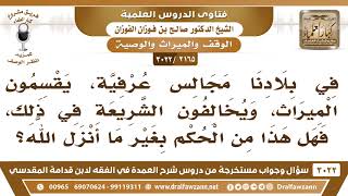 فضيلة الشيخ وفقكم الله. يقول السائل في بلادنا مجالس عرفية يقسمون الميراث ويخالفون الشريعة في ذلك. فهل هذا من الحكم بغير ما انزل الله؟ بلا شك يقسم المواريث على غير ما انزل الله هذا حكم بغير ما انزل الله فلا يجوز هذا. نعم - 00:00:00ضَ