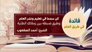 مما ينبغي للطالب ان يراعيه ان يكون الطالب سمحا في نشر العلم فاذا تعلم فائدة فليبادر بنشرها بين يدي زملائه واذا عرف شيئا لم يعرفه الطلاب فليبادر الى تعليمهم واذا كان هناك احد من الطلبة كان لم يكن لم يكن جيد الذهن او الفهم بل - 00:00:00ضَ