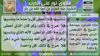 لكن يخص الزوجة باشياء تناسبها تناسب امثالها فلا بأس بالزوجة ملابس تناسبها وللامس تناسبها فاذا كل اعطى كل واحدة ما يناسبها فلا حرج في ذلك ولو كان الذي اعطى الزوجة اكثر او اعلى - 00:00:20ضَ