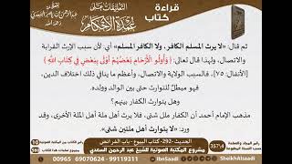 واولو الارحام بعضهم اولى ببعض في كتاب الله فالسبب الولاية والاتصال واعظم ما ينافي ذلك اختلاف الدين فهو مبطل للتوارث حتى بين الوالد وولده وهل يتوارث الكفار بينهم مذهب الامام احمد ان الكفار ملل شتى - 00:01:59ضَ