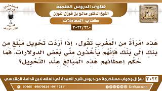 فضيلة الشيخ وفقكم الله يقول هذه امرأة من المغرب تقول اذا اردت تحويل مبلغ من بنك الى بنك فانهم يأخذون مني بعض الدولارات فما حكم اعطائهم هذه المبالغ عند التحويل - 00:00:00ضَ