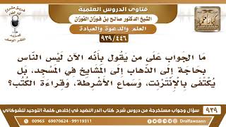 فضيلة الشيخ وفقكم الله ما الجواب على من يقول بانه الان ليس الناس بحاجة الى الذهاب الى المشائخ في المسجد فليكتفى بالانترنت وسماع الاشرطة وقراءة الكتب هذا مضلل مثل اللي قلتم انه يقول لا تدعون الناس الى التوحيد - 00:00:01ضَ