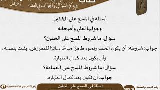 على العمامة. جواب ان تكون بعد كمال الطهارة. سؤال ما شروط المسح على العمامة؟ جواب ان تكون لرجل محنكة او ذات دؤابة طاهرة ساترة لما لم تجري العادة بكشفه. سؤال ما - 00:08:31ضَ