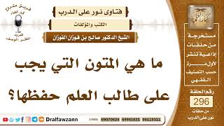 جزاكم الله خيرا. ما هي المتونة التي يجب على طالب العلم حفظها؟ وجوه كثيرة وكل فن فيه متن آآ الفقه فيه مثل الزاد مثلا نعم الحديث في متن بلوغ المرام من احاديث الاحكام الاصول فيها متن الروضة بن قدام - 00:00:00ضَ