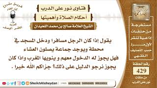 احد المستمعين بعث برسالة وضمنها جمعا من الاسئلة في احدها يقول اذا كان الرجل مسافرا ودخل المسجد في محطة ويوجد ما يصلون العشاء فهل يجوز له الدخول معهم وينويها المغرب؟ واذا كان يجوز نرجو الدليل على ذلك جزاكم الله خيرا واحسن اليكم - 00:00:00ضَ