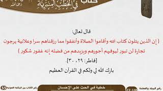 وجنات تجري من تحتها الانهار خالدين فيها. ونعم اجر العاملين. من الله علي وعليكم بتحقيق التقوى. وجعلنا واياكم ممن استمسك بالعروة الوثقى. وبارك لي ولكم في القرآن العظيم. ونفعني واياكم بما فيه من الايات والذكر الحكيم. خطبة في الحث على الاحسان. الحمد لله الذي وعد المنفقين - 00:03:41ضَ