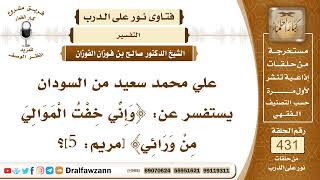 جزاكم الله خيرا علي محمد سعيد من السودان استفسر عن اني خبت الموالي من ورائي من سورة مريم. خفت وانا عليه الصلاة والسلام آآ لما كان لم يأتي الى اولاد خشي ان لا يكون بعده من يقوم آآ من يقوم بواجب - 00:00:00ضَ