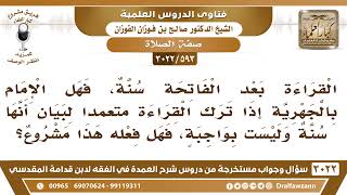 فضيلة الشيخ وفقكم الله يقول القراءة بعد الفاتحة سنة فهل الامام بالجهرية اذا ترك القراءة متعمدا ببيان انها سنة وليست بواجبة؟ فهل فعله هذا مشروع لا سنة مؤكدة ولا يتركها - 00:00:00ضَ