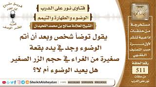 احسن الله اليكم هذه رسالة باعثها المستمع سين راء راء. يقول توضأت او توضأ شخص وبعد ان اتم الوضوء وجد في يده بقعة صغيرة من الغرا في حجم الزر الصغير هل يعيد الوضوء ام لا - 00:00:00ضَ
