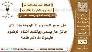 السؤال الخامس والاخير في رسالة الاخ حسن يقول فيه هل يجوز الوضوء في الحمام واذا كان اه جايز هل يسمي ويتشهد اثناء الوضوء؟ افيدونا افادكم الله. الانسان اذا اراد ان يدخل بيت الخلاء كما - 00:00:00ضَ