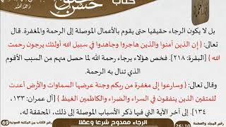 يكون الرجاء حقيقيا حتى يقوم بالاعمال الموصلة الى الرحمة والمغفرة. قال تعالى ان الذين امنوا والذي حين هاجروا وجاهدوا في سبيل الله اولئك يرجون رحمة الله. فخص هؤلاء برجاء رحمة الله - 00:10:51ضَ