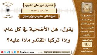 يقول هل الاضحية في كل عام واذا تركها المقتدر؟ ماذا عليه؟ نعم الاضحية في كل عام ولمن يقدر عليها هذا افضل. اما هي ليست واجبة اذا تركها ليس عليه شيء لكن اذا فعلها فله اجر عظيم لا يفوته هذا الاجر العظيم وهو يستطيع. نعم - 00:00:00ضَ