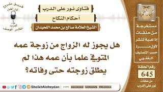 يسأل فيها السؤال التالي هل يجوز له الزواج من زوجة عمه المتوفي؟ علما بان عمه هذا لم يطلق زوجته حتى وفاته ويقول الاخ عبدالله في نهاية رسالته ارشدونا هداكم الله - 00:00:00ضَ