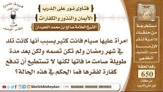 تقول السائلة ايضا امرأة اه عليها صيام فائت اه كثير بسبب انها كانت تلد في شهر رمظان ولم تكن تصمه. ولكن بعد مدة طويلة صامت ما فات لكنها لا تستطيع ان تدفع كفارة لفقرها. فما الحكم في هذه الحالة - 00:00:00ضَ