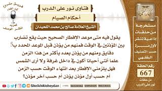 ام حسب اول مؤذن يؤذن ام حسب اخر مؤذن الامر مبني على اليسر وهذه العبادة معلقا وقتها على طلوع الفجر وغروب الشمس والمؤذنون انما هم يعلمون بذلك الوقت فاذا اذن المؤذن الثقة - 00:00:20ضَ
